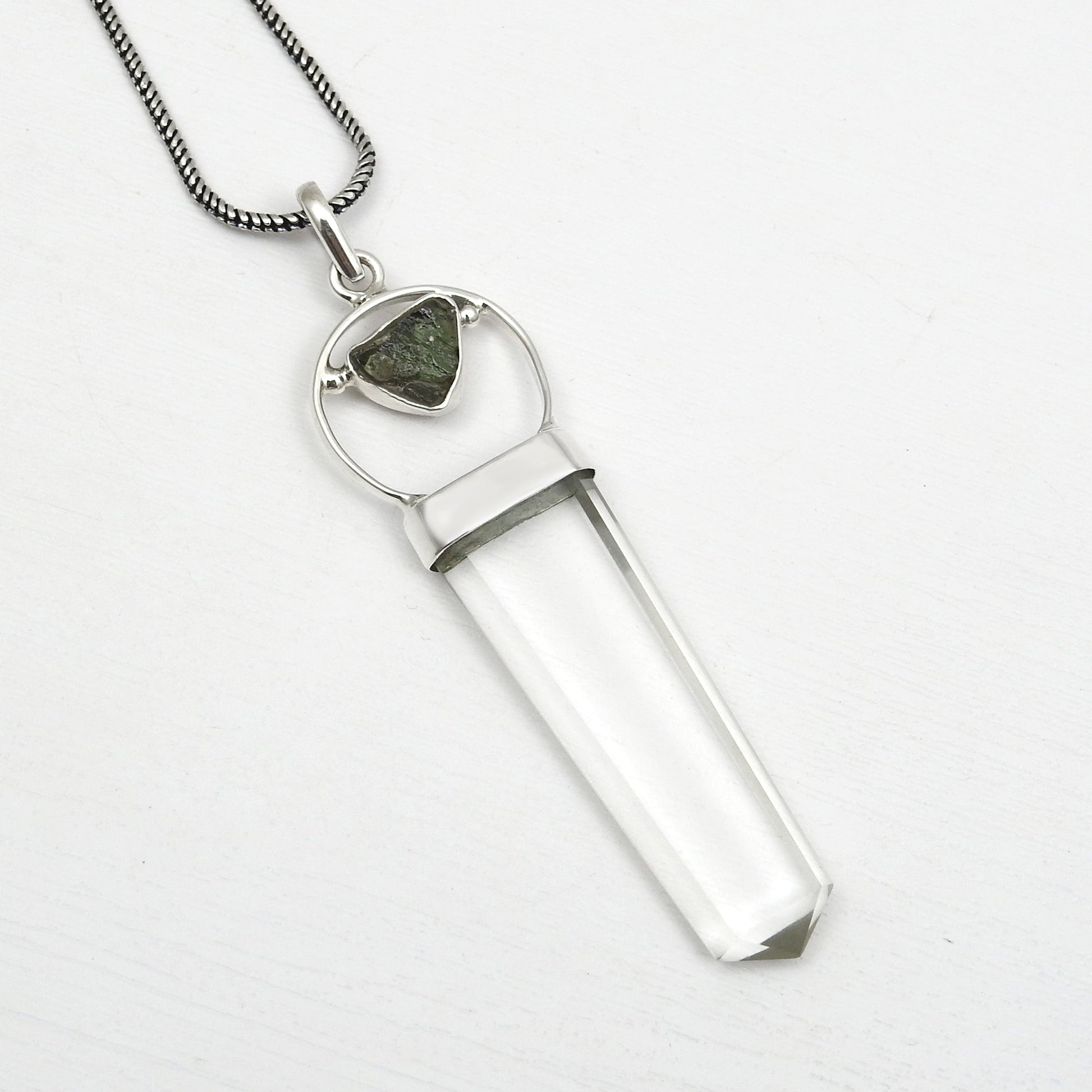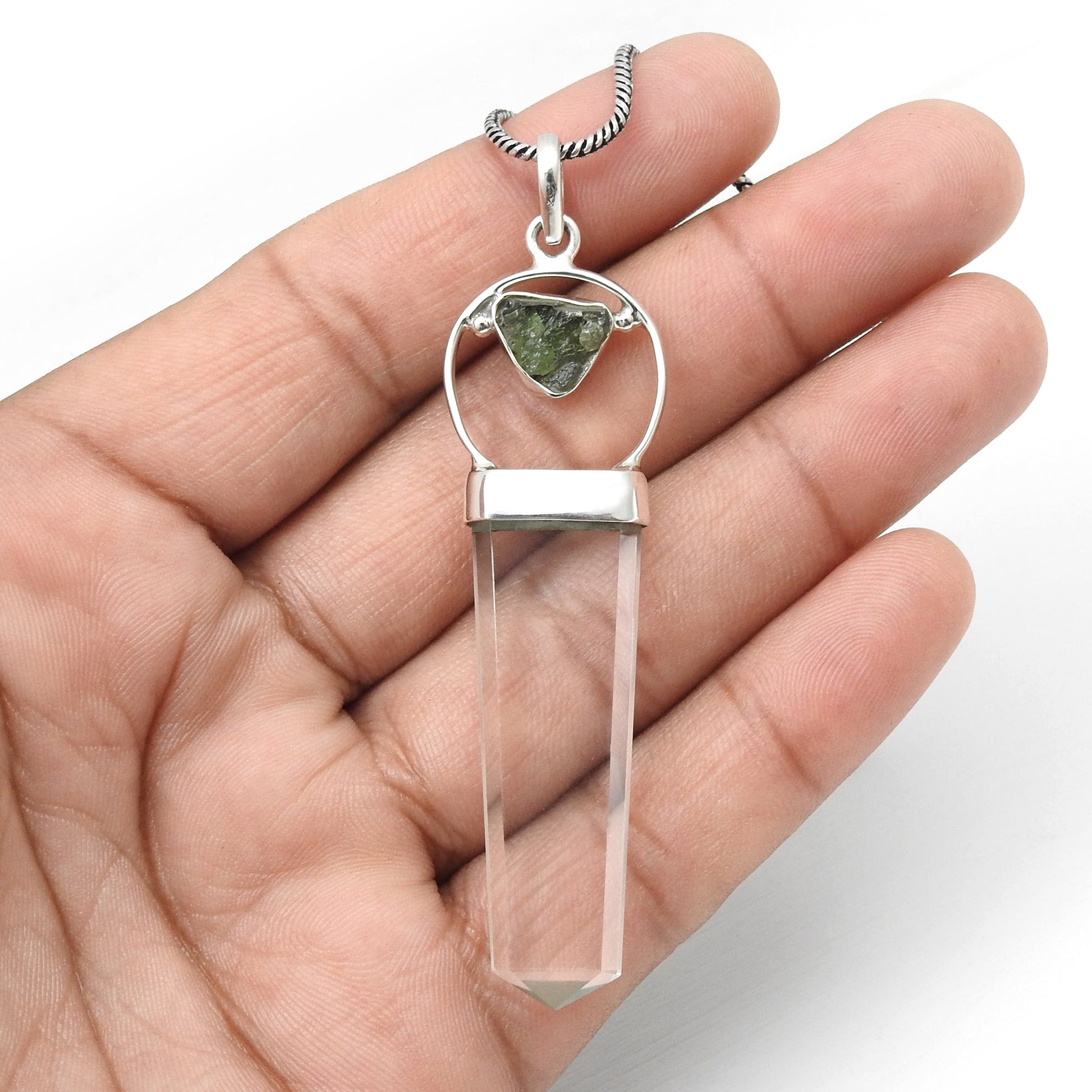 Natural Moldavite Crystal 925 Sterling Silver Pencil Pendant Jewelry