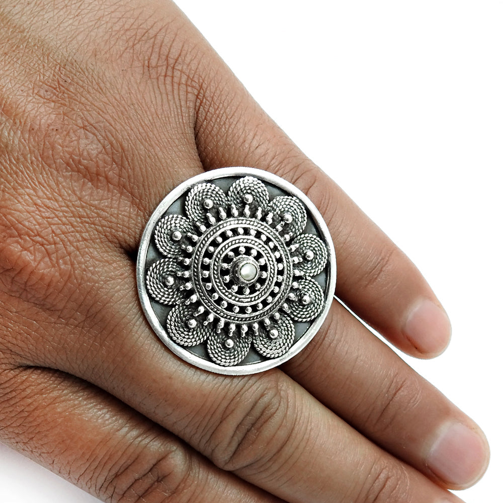 925 Silver Natural Pearl Statement Antique Flower Adjustable Ring