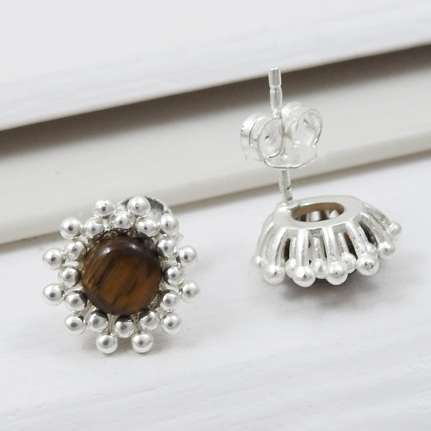 Natural Tiger Eye 925 Sterling Silver Flower Stud Earrings